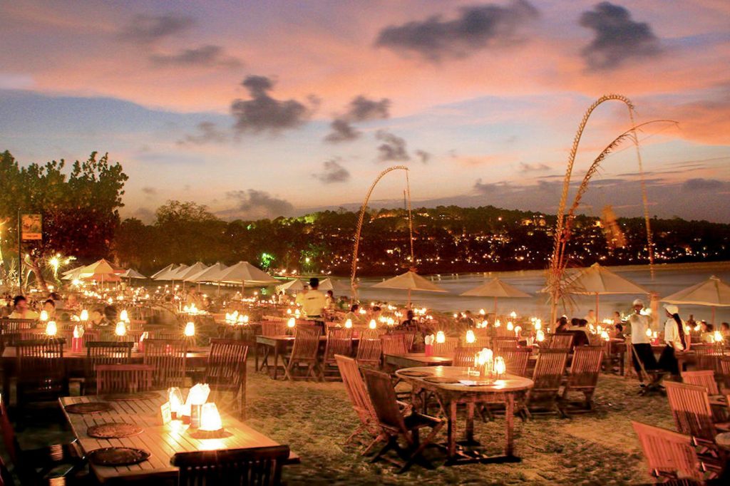 Mostly open from afternoon until late, each Jimbaran seafood cafe serves freshly grilled seafood at candlelit tables laid out on the beachfront. As the sun goes down, the horizon features faint lights from Ngurah Rai Airport and traditional fishing boat lanterns at sea.